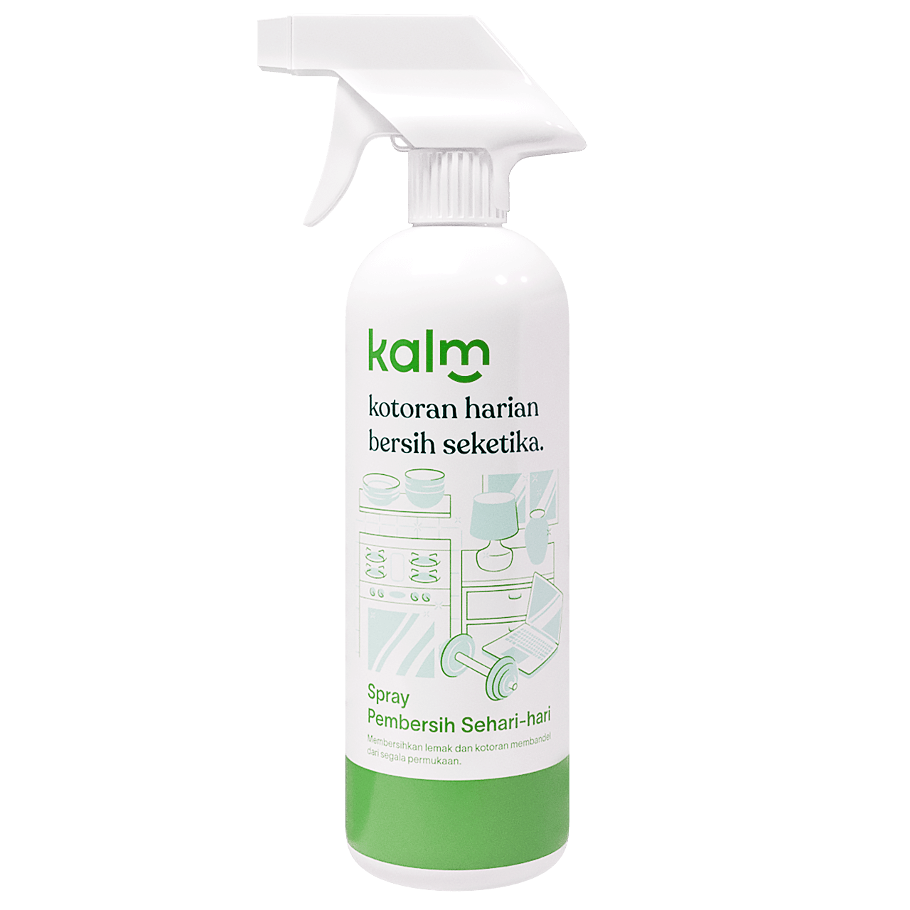 Kalm Spray Pembersih Sehari-hari — solusi ampuh untuk membersihkan berbagai permukaan rumah dari minyak dan kotoran membandel. Ideal untuk digunakan pada: kompor, kulkas, microwave, over, meja dapur, meja makan, lantai, alat elektronik, perabot, mainan anak, dan lainnya.